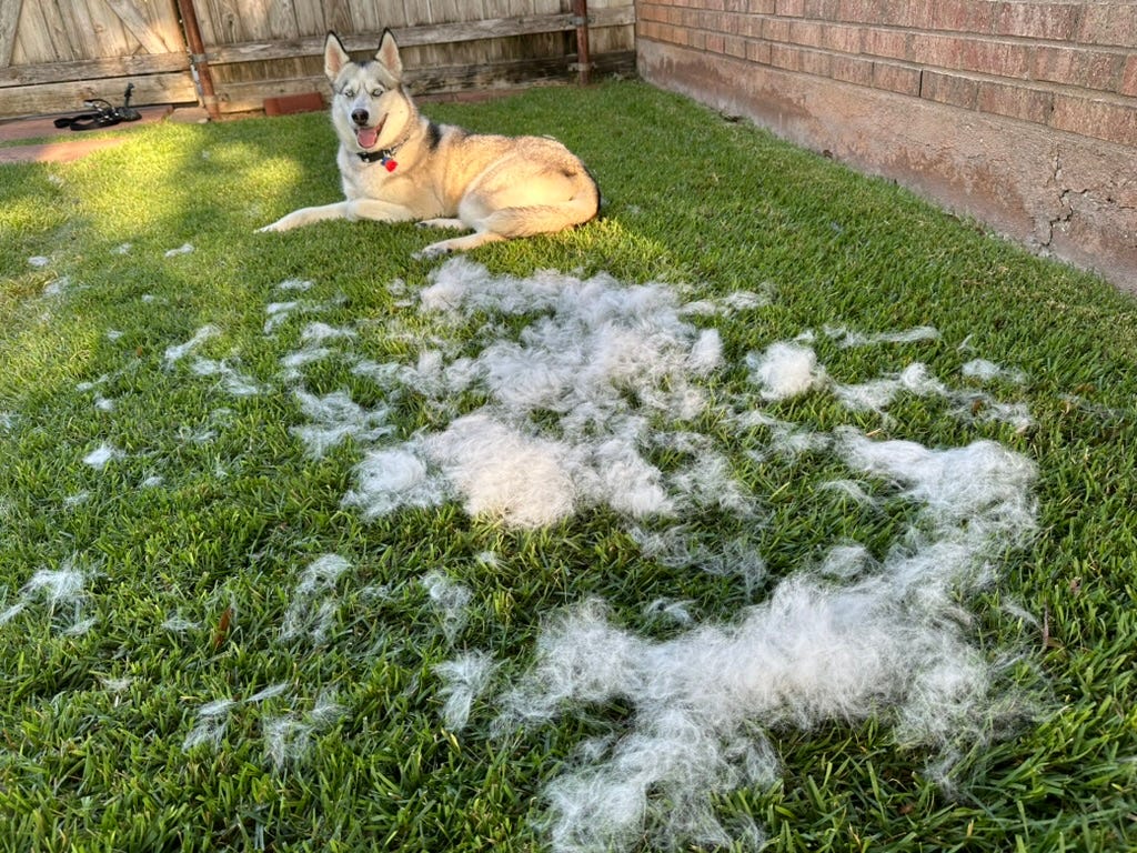 Our two-times-a-year shedding is when we “blow out” our undercoats as we prepare for a change in seasons. Depending on our circumstances and environments, that can happen quickly or be drawn out as long as a month. And that can be a lot of fur. Like in this picture. This one was taken right after Momma and Daddy rescued me from the animal shelter.